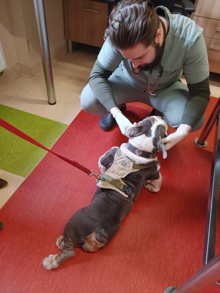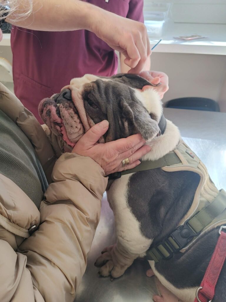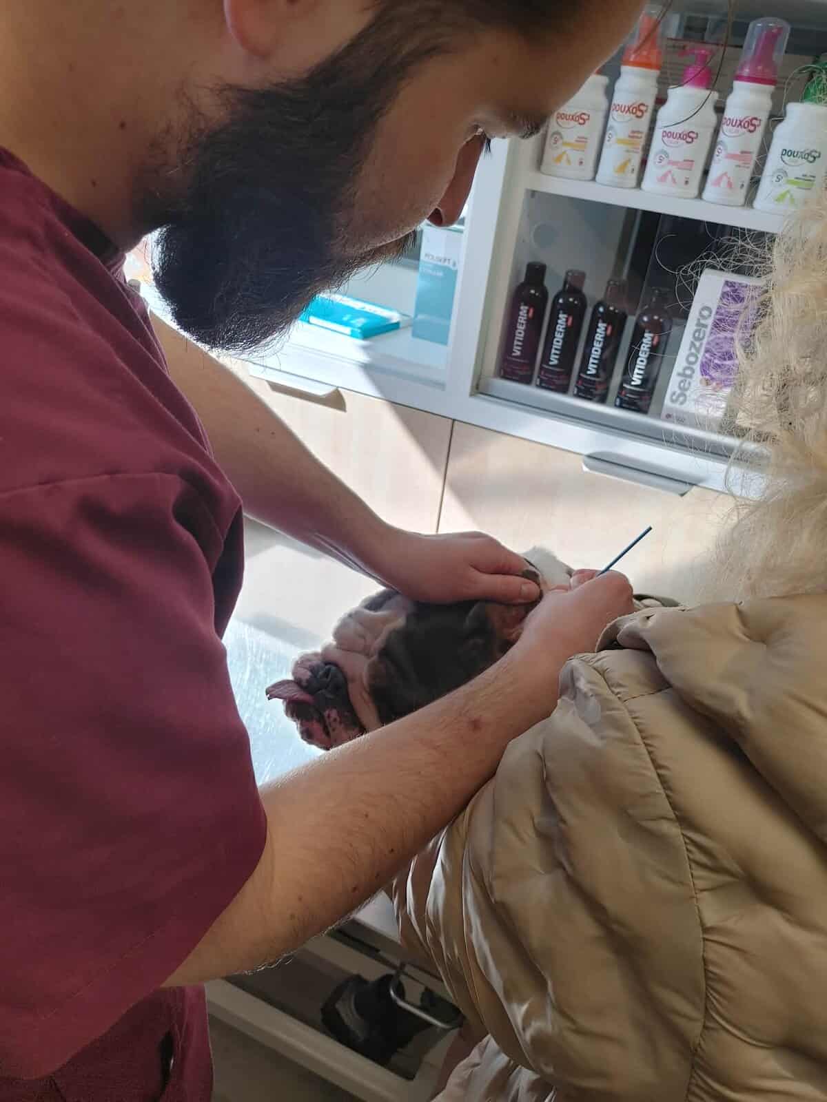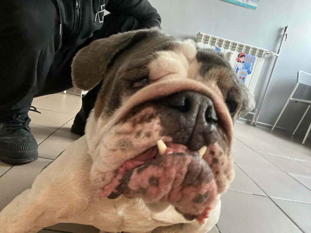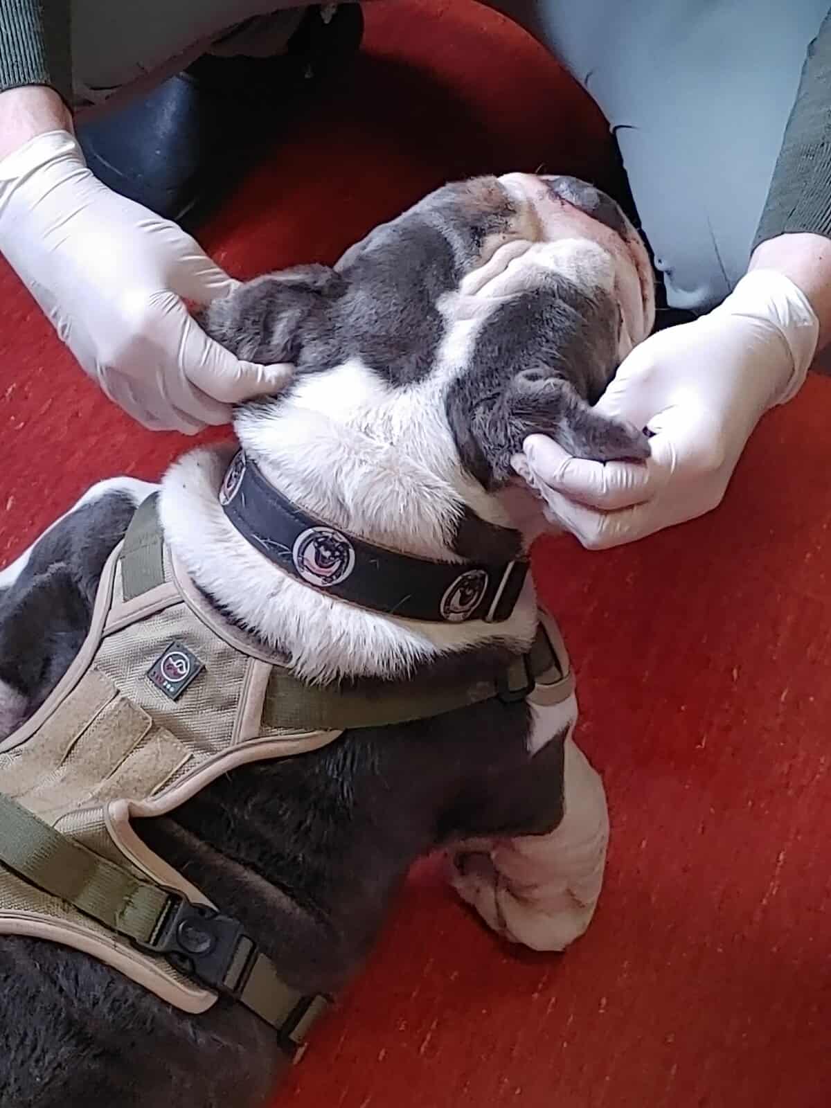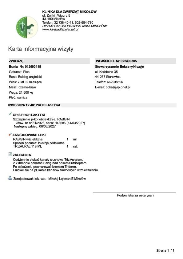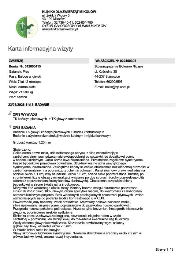 Niestety, mniej optymistyczne wieści płyną z kontroli uszu i fałdek. Brak znaczącej poprawy zmusił nas do wdrożenia mocniejszych leków i antybiotykoterapii. Korzystając z narkozy podczas nadchodzącego badania TK, wykonamy u Buni także gruntowne czyszczenie uszu. Przy okazji wizyty Bunia została również zaszczepiona.