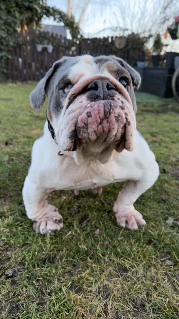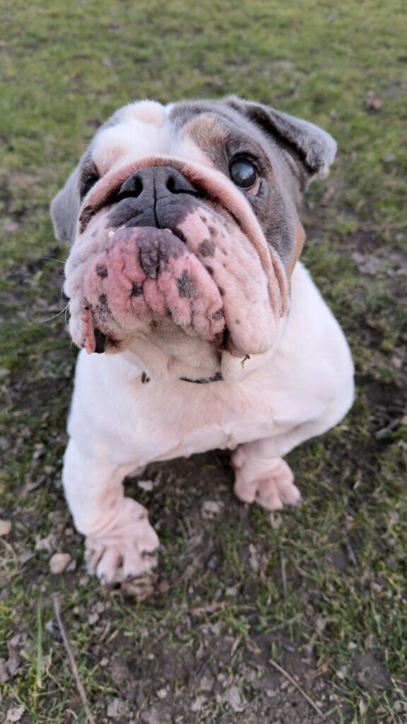 Dziś naszą podopieczną została buldożka angielska, znaleziona w dniu 10.02.26 przy głównej trasie obok Pustyni Błędowskiej, leżącej na granicy Wyżyny Śląskiej i Wyżyny Olkuskiej, miejscowość Bukowno, woj. małopolskie. Dzięki dobrym osobom została zabezpieczona i przekazana do nas. Zgodnie z obowiązującymi przepisami poszukujemy „właściciela” suni.